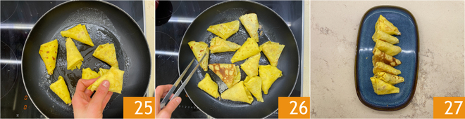 Maintenant, faites fondre le beurre dans une poêle antiadhésive, déposez les petits paquets 25 et laissez-les dorer à feu vif pendant 1-2 minutes de chaque côté 26. Vos benderniki sont prêts à être dégustés encore chauds 27 !