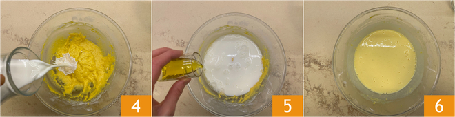 Ajoutez le lait 4 et l'huile 5 et mélangez à nouveau jusqu'à obtenir une pâte lisse et sans grumeaux 6.