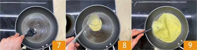Graissez avec du beurre une poêle antiadhésive de 20-22 cm 7 et, une fois chaude, versez au centre une louche de pâte 8. Faites cuire à feu moyen pendant 1-2 minutes; lorsque les bords commencent à se détacher, retournez délicatement la crêpe avec une spatule 9.