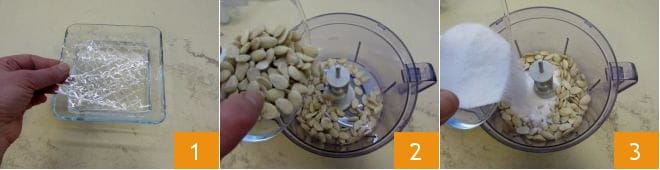 Pour préparer le blanc-manger, faites ramollir la gélatine en feuilles dans un récipient avec de l'eau froide pendant au moins 10 minutes 1. Placez les amandes émondées 2 avec le sucre dans un mixeur équipé de lames 3