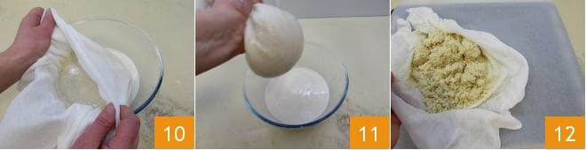 puis pressez bien le torchon pour faire sortir tout le liquide et le recueillir dans le bol (10-11). Mettez les amandes hachées et ramollies contenues dans le torchon sur une plaque de cuisson recouverte de papier sulfurisé 12,
