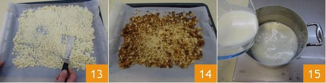 en les répartissant de manière homogène à l'aide d'une spatule 13 : vous pourrez les utiliser pour la décoration finale. Faites cuire dans un four statique préchauffé à 180° pendant 30 minutes (ou à 160° pendant 20 minutes si dans un four ventilé), jusqu'à ce qu'elles deviennent bien dorées et croustillantes 14 ; sortez du four, laissez refroidir complètement et mettez de côté. Versez le liquide que vous avez préalablement obtenu dans une casserole, faites-le chauffer à feu doux pendant 3-4 minutes (il ne doit pas atteindre l'ébullition) 15.