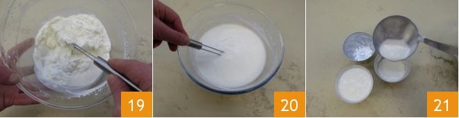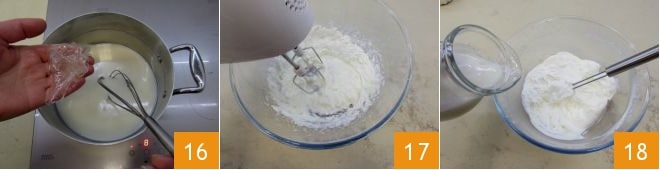 Pressez bien la gélatine en feuilles et ajoutez-la au mélange 16, en mélangeant bien jusqu'à dissolution complète, puis éteignez et laissez refroidir. Montez la crème avec un fouet 17 et, lorsque le mélange sera complètement froid, incorporez-le à la crème fouettée petit à petit 18;