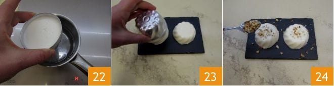 mélangez le tout délicatement en faisant attention à ne pas le démonter (19-20). Versez le mélange dans 5 moules de 100 g chacun 21 et laissez refroidir au réfrigérateur pendant 6 heures.