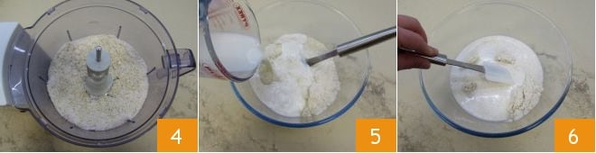 et hachez-les 4. Transférez les amandes hachées dans un bol, versez le lait 5 et mélangez bien avec une spatule 6