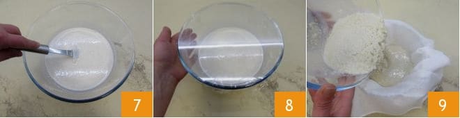 afin d'obtenir un mélange homogène et sans grumeaux 7 ; couvrez avec du film plastique et laissez infuser pendant une nuit entière 8. Une fois le temps écoulé, filtrez le mélange à travers un tissu placé à l'intérieur d'un bol 9,