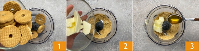 Pour préparer les verrines ricotta et framboises, commencez par mettre les biscuits dans un mixeur 1 et mixez jusqu'à obtenir une poudre. Ajoutez le beurre pommade 2 et le miel 3.