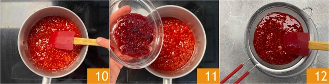 Faites cuire à feu doux en remuant continuellement 10 jusqu'à ce que les framboises se soient défaites, cela prendra environ 5 minutes. Ajoutez la confiture de framboises 11 et mélangez une dernière fois pour amalgamer les ingrédients. Passez le mélange au travers d'un tamis à mailles fines pour éliminer les graines des framboises 12 et laissez refroidir complètement.
