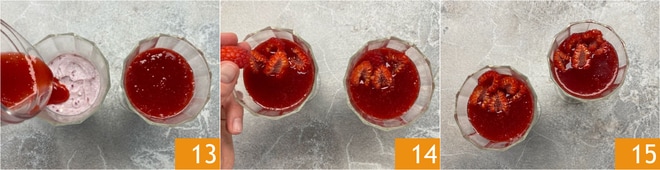 Une fois refroidi, versez le coulis de framboises dans les verrines 13 et garnissez de framboises fraîches 14. Vos verrines ricotta et framboises sont prêtes à être servies 15 !