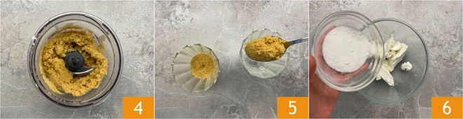 Mixez à nouveau jusqu'à obtenir un mélange à la consistance sableuse 4. Répartissez le mélange de biscuits au fond de 4 verrines d'une capacité de 200 ml 5, nivelez et laissez durcir au réfrigérateur pendant au moins 30 minutes. Pendant ce temps, mettez la ricotta et le sucre dans un bol 6.