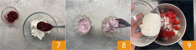 Ajoutez la confiture de framboises 7 et mélangez jusqu'à obtenir une crème homogène. Reprenez les verrines et remplissez-les avec la crème 8, puis nivelez et remettez au réfrigérateur pendant au moins 20 minutes. Pendant ce temps, préparez le coulis de framboises : dans une casserole, mettez les framboises et le sucre 9.