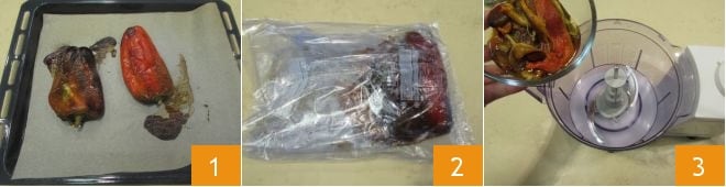 Pour cuisiner les bigoli en sauce de poivrons rouges, commencez par préparer la sauce. Lavez et séchez vos poivrons rouges, placez-les sur une plaque recouverte de papier sulfurisé et mettez-les au four statique préchauffé à 250°C pendant environ 25 minutes. Tournez les poivrons rouges de temps en temps jusqu'à ce que la peau se dessèche et commence à se détacher de la chair 1. Lorsque la peau commence à se détacher, retirez les poivrons rouges du four et placez-les dans un sac alimentaire 2. Fermez le sac et laissez les poivrons rouges suer jusqu'à ce qu'ils soient tièdes. À ce point, vous pouvez retirer la peau des poivrons rouges. Une fois cette opération effectuée, coupez les poivrons en deux, retirez la tige verte extérieure, les filaments blancs et aussi les graines internes. Prenez la chair ainsi obtenue des poivrons et mettez-la dans le bol d'un mixeur 3.