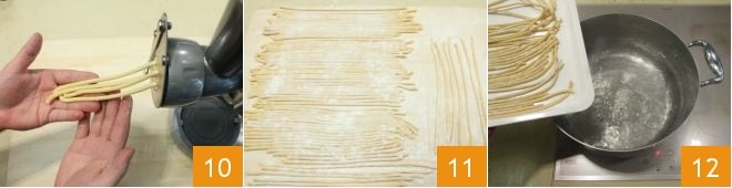 La pâte ainsi obtenue doit reposer pendant au moins 30 minutes à température ambiante. Après les 30 minutes de repos, prenez-la et divisez-la en morceaux plus petits. Insérez un morceau de pâte dans le panier de la machine à faire les bigoli. Actionnez la machine et créez les bigoli 10. Disposez les bigoli ainsi obtenus sur une planche farinée pour éviter qu'ils ne collent 11. Répétez l'opération pour tous les morceaux de pâte. Passez maintenant à la cuisson des bigoli. Prenez-les et faites-les cuire dans une grande quantité d'eau salée 12.