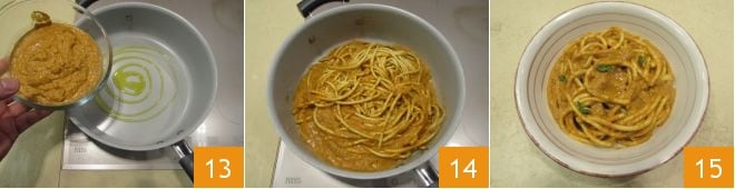 Maintenant, dans une poêle, chauffez, après avoir ajouté un filet d'huile, la sauce aux poivrons 13. Égouttez bien vos bigoli et assaisonnez-les avec la sauce de poivrons 14. Ajoutez la touche finale : pour décorer vos bigoli en sauce de poivrons rouges, utilisez des feuilles de marjolaine. Servez les bigoli en sauce de poivrons rouges bien chauds 15.