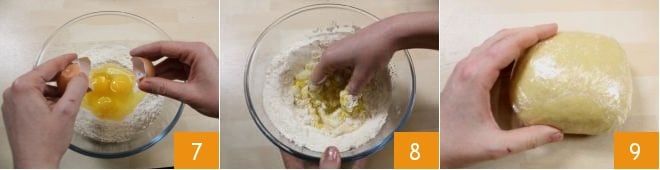 Passez maintenant aux bigoli avec la préparation des pâtes fraîches. Dans un bol, versez la farine tamisée. Formez une fontaine avec la farine et, après avoir créé un creux au centre, versez les œufs 7 et ajoutez une pincée de sel. Commencez à mélanger les œufs avec la farine et intégrez progressivement la farine aux œufs 8. Lorsque les œufs et la farine sont bien amalgamés, continuez à pétrir énergiquement à la main pendant au moins 10 minutes. Vous devez obtenir une pâte douce et homogène, à laquelle vous donnerez la forme d'une boule. Couvrez ensuite votre boule avec un film plastique 9.