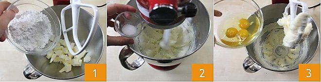 Pour préparer les biscuits arlequin, montez, avec un robot muni d'une feuille ou avec les fouets d'un batteur électrique, le beurre mou à température ambiante avec le sucre glace 1, jusqu'à obtenir un mélange mousseux. Ajoutez le sel 2 et les œufs 3, puis mélangez jusqu'à ce que tous les ingrédients soient bien amalgamés.
