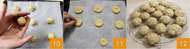 Modelez chaque petit tas en forme sphérique 10 et aplatissez-les légèrement, puis déposez, sur chaque biscuit, quelques vermicelles colorés restants 11. Enfournez, dans un four statique déjà chaud à 180° pour 10 minutes (four ventilé 160° pour 7-8 minutes), ou jusqu'à ce que les biscuits soient dorés sur les bords. Sortez-les et laissez-les refroidir sur une grille 12 : voilà prêts les joyeux biscuits arlequin !