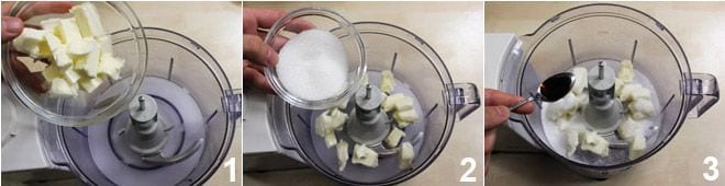 Pour préparer les sablés, mettez dans un mixeur le beurre ramolli à température ambiante et coupé en dés 1, le sucre en poudre 2, le sel et l'extrait de vanille 3.