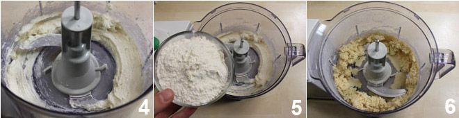 Actionnez le mixeur et réduisez les ingrédients en crème 4. Tamisez la farine, ajoutez-la au mélange 5 et actionnez le mixeur pour obtenir une pâte sableuse 6.