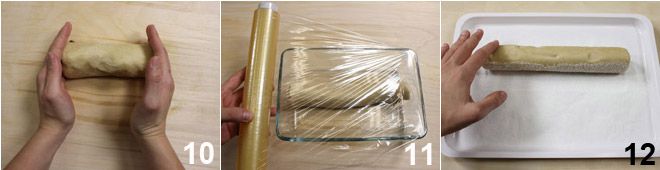 Transférez la pâte sur un plan de travail légèrement fariné 7: elle sera très molle et difficile à travailler, alors compactez-la pour la rendre lisse 8, puis aplatissez-la un peu avec les mains, couvrez-la d'un film plastique 9 et placez-la au réfrigérateur pour la faire durcir pendant au moins une demi-heure (ou au congélateur pour accélérer le processus).