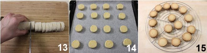 Avec un couteau à lame lisse, coupez les cylindres en disques d'une épaisseur de 2 cm 13, disposez les biscuits obtenus sur une plaque à four recouverte de papier sulfurisé et enfournez-les dans un four préchauffé à 200° C pendant environ 15 minutes, jusqu'à ce qu'ils soient légèrement dorés. Sortez-les du four et transférez-les immédiatement sur une grille 15 afin qu'ils ne continuent pas à cuire avec la chaleur résiduelle de la plaque. Vos sablés sont prêts à être dégustés!