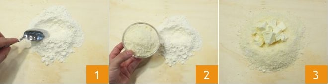 Commencez la préparation des biscuits animaux salés en mettant la farine sur un plan de travail, puis avec une cuillère, formez un puits au centre 1 et versez le parmesan finement râpé 2, ajoutez le beurre en morceaux et le sel 3