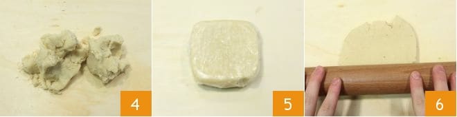 puis pétrissez rapidement avec les doigts jusqu'à obtenir une pâte lisse 4. Formez une boule, enveloppez-la dans un film plastique 5 et laissez reposer au réfrigérateur pendant 30 minutes. Une fois le temps de repos écoulé, reprenez la boule et étalez-la avec un rouleau à pâtisserie sur le plan de travail légèrement fariné 6 pour créer une feuille d'environ 4 mm d'épaisseur