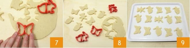 puis, avec l'aide d'emporte-pièces en forme d'animaux (comme des papillons, des oursons et des lapins), découpez les petits biscuits (7-8) et disposez-les sur un plateau 9, placez les biscuits au réfrigérateur pendant au moins 15 minutes, de cette manière, ils garderont leur forme pendant la cuisson.