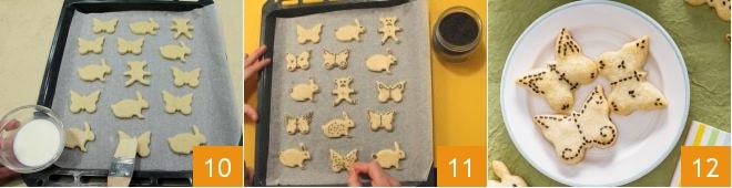 Ensuite, transférez les petits biscuits sur une plaque recouverte de papier sulfurisé et décorez les formes avec les graines de pavot : badigeonnez la surface avec le lait 10 et appliquez les graines de pavot avec un cure-dent pour définir les détails des animaux : les yeux, la bouche, les oreilles ou même simplement le bord de la forme 11. Faites cuire les petits biscuits dans un four statique préchauffé à 180° pendant 10 minutes (si four ventilé à 160 ° pendant 5-6 minutes), puis, une fois cuits, sortez les biscuits du four et laissez-les refroidir sur une grille avant de les déguster 12!