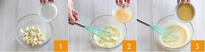 Pour réaliser les biscuits à la farine de maïs et oranges, commencez par couper le beurre en cubes dans un bol et laissez-le à température ambiante pendant environ une heure, puis ajoutez le sucre 1 et mélangez avec un fouet jusqu'à obtenir une consistance crémeuse. Versez l'œuf battu dans le bol 2 et mélangez à nouveau pour l'incorporer au mélange, puis ajoutez la farine de maïs 3 et continuez à mélanger.