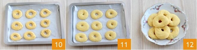 Une fois prêts 10, faites cuire les biscuits dans un four statique préchauffé à 180° pendant environ 15 minutes. Lorsqu'ils sont cuits, sortez-les du four 11 et laissez refroidir vos biscuits à la farine de maïs et oranges avant de les servir 12 !