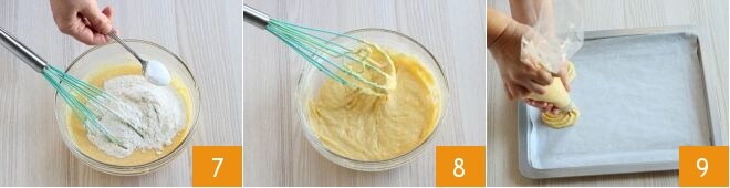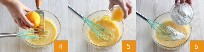 Ajoutez le zeste râpé d'une orange 4 et le jus que vous aurez préalablement filtré 5, enfin ajoutez la farine 0 6