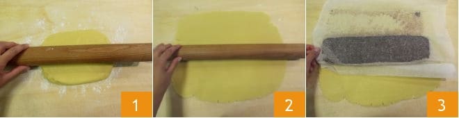 Lorsque la pâte sablée a reposé, reprenez le pâton et étalez-le sur un plan légèrement fariné 1, jusqu'à obtenir un carré d'une épaisseur d'environ un demi-centimètre, long de quelques centimètres de plus que la garniture (environ 34 cm) 2. Placez ensuite au centre du rectangle le mélange de griottes 3, retirez le papier sulfurisé