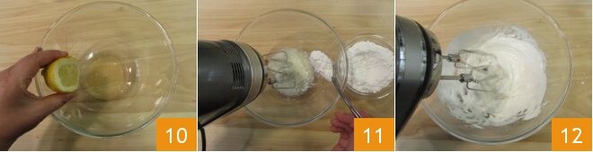 Durant ces 10 minutes, préparez également le glaçage. Versez le blanc d'œuf dans un bol et ajoutez le jus de citron 1. Commencez ensuite à travailler avec les fouets électriques en ajoutant le sucre glace petit à petit 2 jusqu'à obtenir un glaçage épais 3.