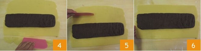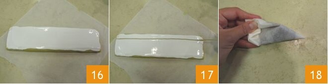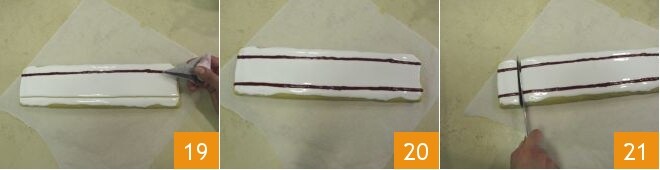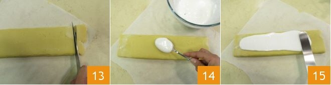 Reprenez ensuite le boudin et avec un couteau, éliminez la partie de pâte sans garniture 13. Déposez un peu de glaçage au centre 14 et étalez-le pour recouvrir toute la surface 15.