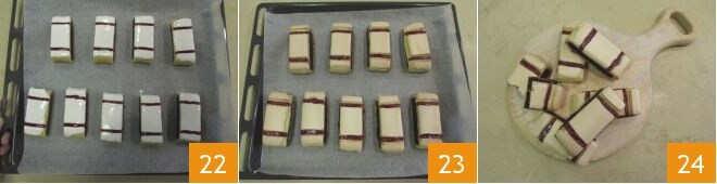 Utilisez-le ensuite pour remplir les sillons juste créés avec le cure-dent (19-20). À ce stade, il ne vous reste plus qu'à couper des biscuits d'environ 3,5 cm de large 21.