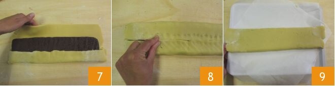 pliez les deux bords vers le centre 7 et avec vos doigts, pincez légèrement la pâte 8 pour qu'elle adhère parfaitement. Retournez ensuite sur un plateau recouvert de papier sulfurisé 9 et placez au réfrigérateur pendant au moins 10 minutes.