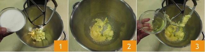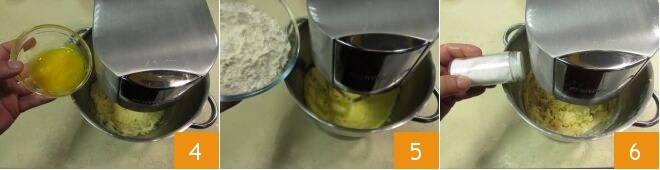 avant d'ajouter aussi les jaunes 4. Travaillez encore pendant quelques minutes jusqu'à ce qu'ils soient complètement absorbés. Toujours avec le batteur en marche à vitesse modérée, versez également la farine 5 et le sel 6.