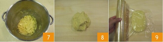 Travaillez encore jusqu'à obtenir une pâte homogène 7. À ce stade, transférez sur un plan, donnez-lui la forme d'un pâton 8 et enveloppez-le dans du film plastique 9. Laissez reposer au réfrigérateur pendant au moins 1 heure.