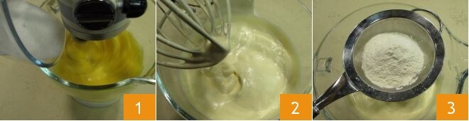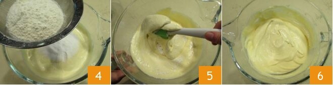 et la farine 4. Mélangez avec une spatule de bas en haut 5 avec des mouvements très délicats pour ne pas démonter le mélange. Lorsque vous obtenez une pâte uniforme 6