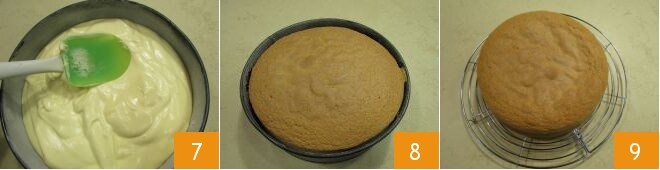 versez-la dans le moule 7 et faites cuire dans un four statique préchauffé à 180 °C pendant 25 minutes au milieu du four. Faites toujours le test du cure-dent avant de retirer le gâteau du four. Une fois cuit, sortez le génoise du four 8, et faites attention à ne pas vous brûler, démoulez-le immédiatement et laissez-le refroidir complètement sur une grille 9.
