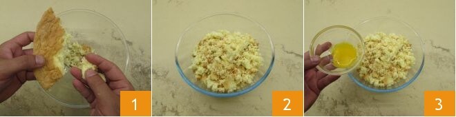 Lorsque le génoise est complètement froid et que la pâte sablée est presque prête à être utilisée, vous pouvez commencer à préparer la garniture. Émiettez le génoise dans un bol (1-2), vous aurez besoin de 200 grammes. Ajoutez ensuite le jaune d'œuf 3,