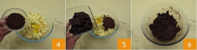 le cacao 4 et la confiture de griottes 5. Pétrissez le tout avec vos mains 6