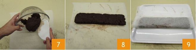 jusqu'à obtenir une pâte homogène et moelleuse 7. Transférez ensuite sur une feuille de papier sulfurisé que vous aurez placée sur le plan de travail 8. À l'aide d'une spatule, donnez à la pâte une forme rectangulaire de 32x7 cm 9 et placez au réfrigérateur pendant 30 minutes.
