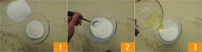 Pour préparer les petits biscuits à la noix de coco sans gluten, versez la noix de coco râpée dans un bol et ajoutez le sucre semoule 1, mélangez avec une cuillère 2 et ajoutez les blancs d'œuf 3.