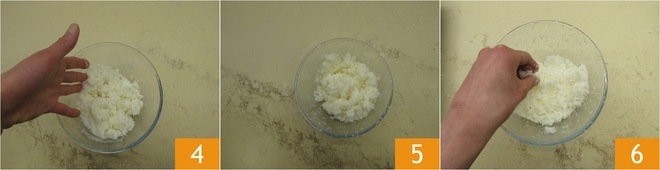 Mélangez soigneusement le tout et pétrissez avec les mains 4 jusqu'à obtenir un mélange homogène 5. Prenez maintenant une petite quantité de pâte, environ 5-6 grammes, et pincez-la avec les mains pour créer un petit cône 6.