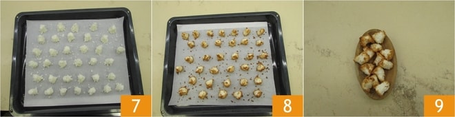 Transférez au fur et à mesure les petits cônes sur une plaque de cuisson recouverte de papier sulfurisé, en les espaçant bien 7 ; vous en obtiendrez environ 35. Ensuite, faites cuire dans un four ventilé préchauffé à 190° pendant environ 10 minutes, surveillez-les jusqu'à ce qu'ils soient dorés en surface. Retirez vos petits biscuits à la noix de coco sans gluten 8 du four et laissez-les refroidir avant de les déplacer car chauds, ils seront mous et pourraient se casser. Une fois refroidis, vous pourrez les servir 9.