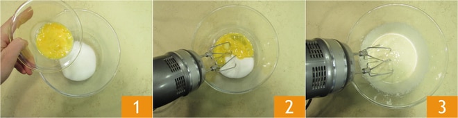 Pour préparer les biscuits à la pistache, faites fondre le beurre à feu très doux (ou au micro-ondes) et laissez tiédir. Versez dans un bol le sucre et l'œuf légèrement battu 1, battez avec un fouet électrique 2 jusqu'à obtenir un mélange mousseux 3.