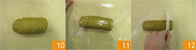 Formez un pâton 10, enveloppez-le dans du film alimentaire 11 et mettez-le au réfrigérateur pour environ 1 heure. Passé le temps nécessaire, sortez la pâte du réfrigérateur et découpez des morceaux d'environ 20 g avec une corne 12.