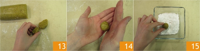 Vous devrez obtenir environ 20 pièces 13. Formez des petites boules avec les mains 14. Roulez les boules dans le sucre glace 15 et